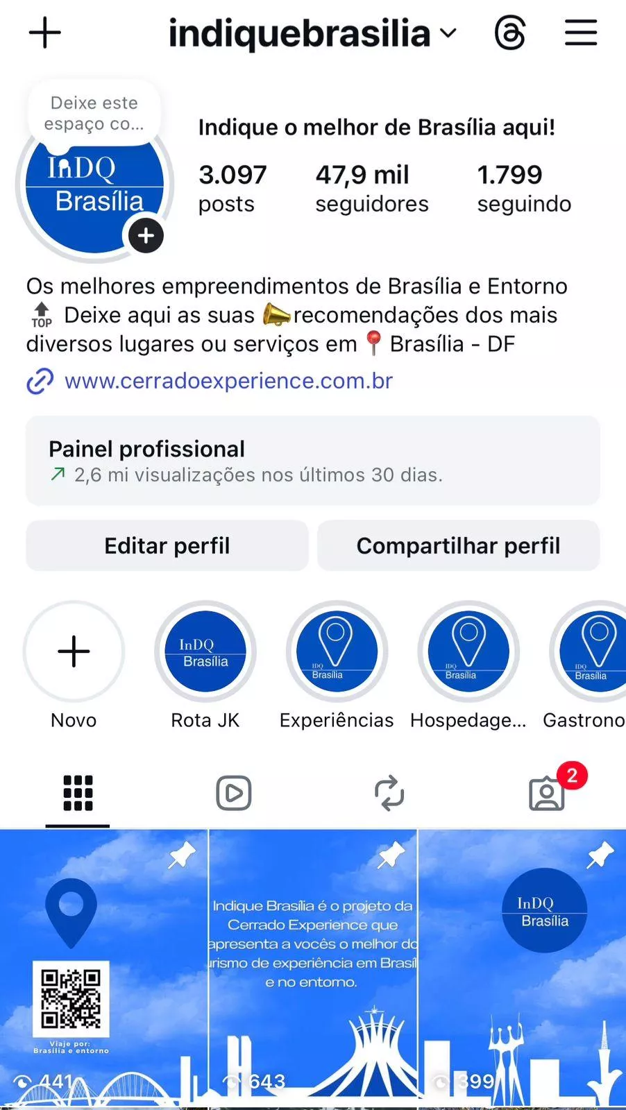 Com o Pack de Templates + Permissão de Reposts e Collabs do Indique Brasília por um mês, substitua a divulgação física por um modelo digital sustentável e estratégico. Aumente a visibilidade do seu negócio em um perfil regional consolidado de Brasília e Entorno, com mais de 2.000.000 de visualizações mensais e mais de 45.000 seguidores. Adquira o pacote agora e aumente a visibilidade do seu negócio com a estratégia certa.